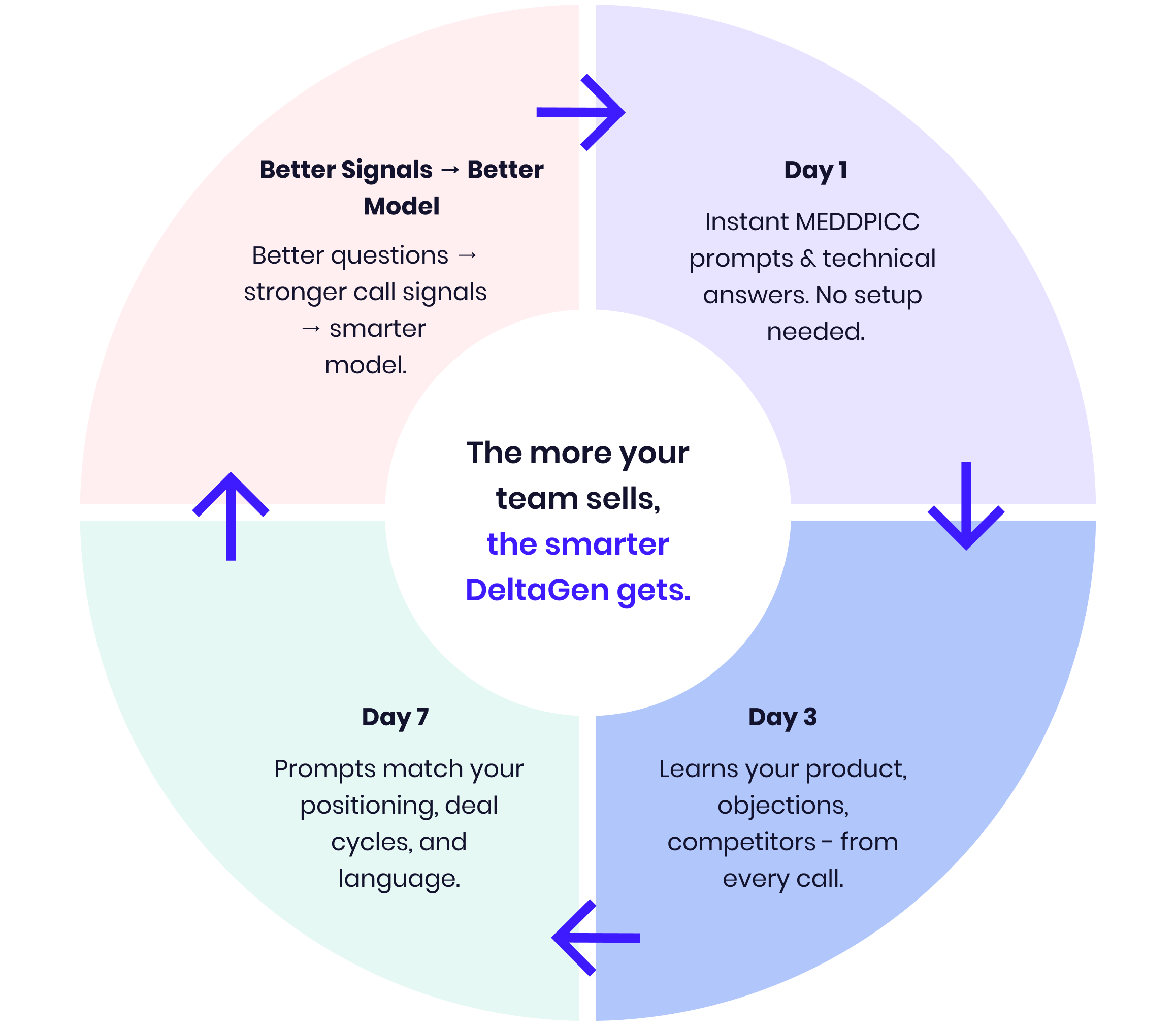 DeltaGen works across Zoom, Microsoft Teams, phone, and video calls, pulls verified specs and insights from Salesforce and HubSpot, and complements tools like Gong and Apollo by filling the live-call execution gap.