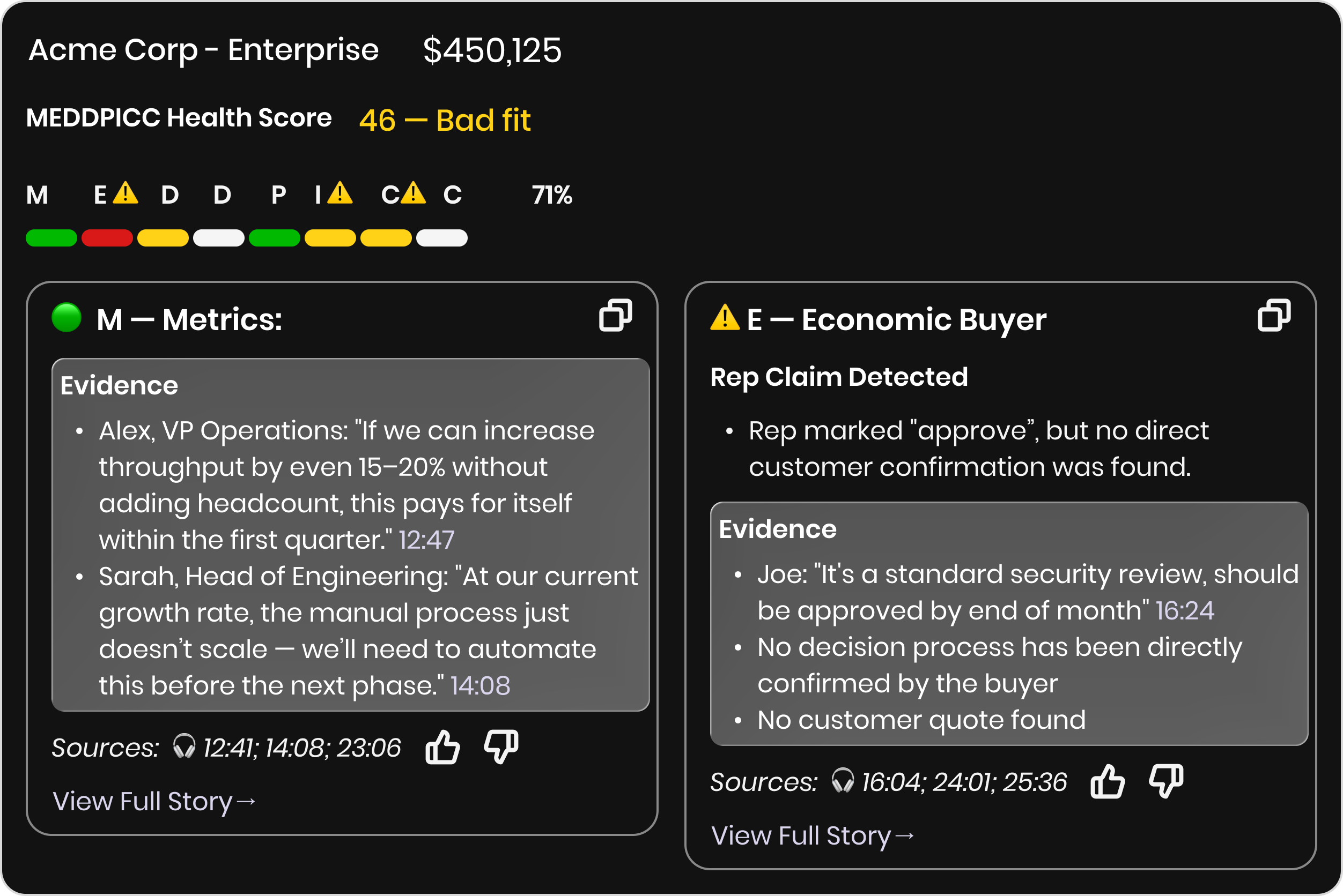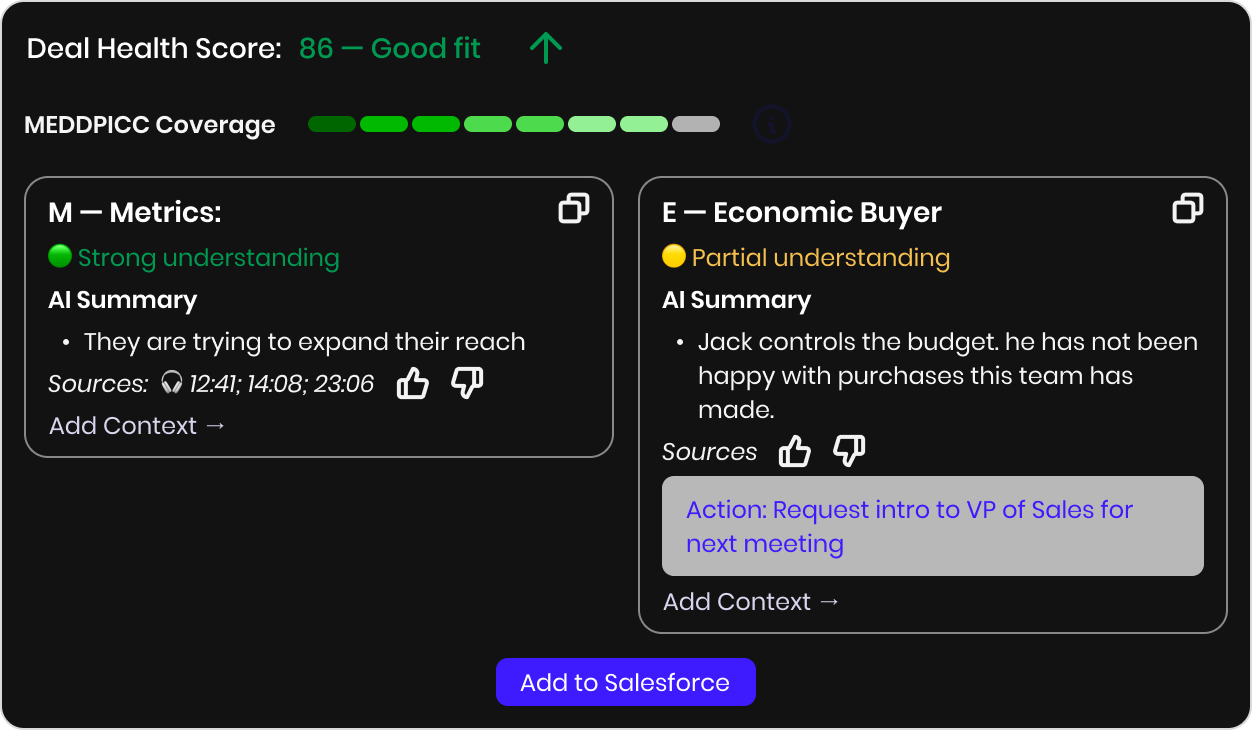 MEDDPICC prompts that feel natural, not robotic. Captures what the customer actually said - not what your rep thinks they heard.