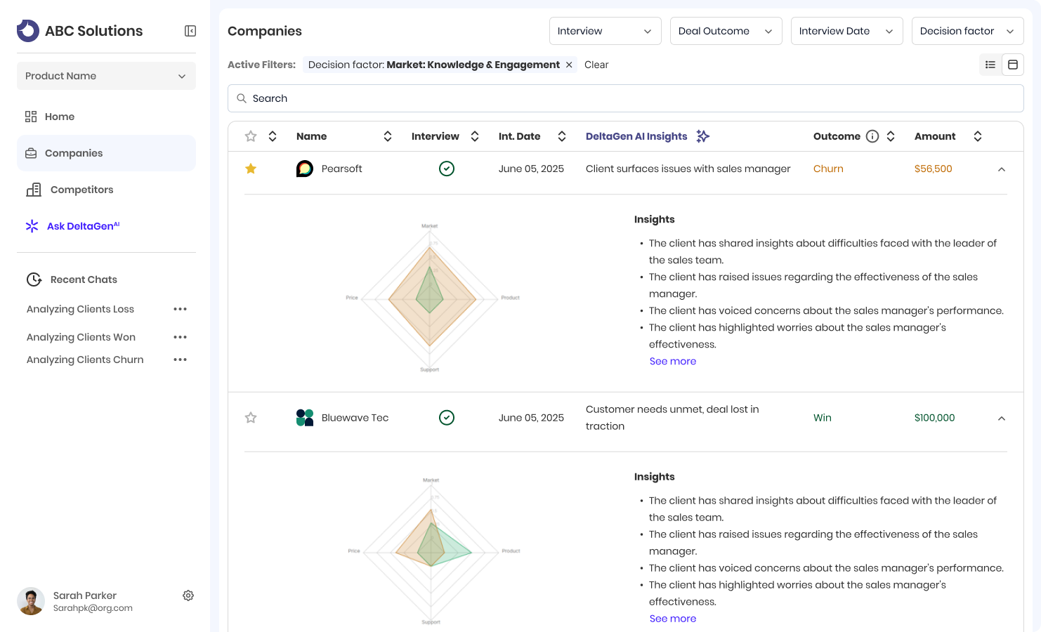 DeltaGen learns from thousands of real win/loss interviews to ask smarter, deeper questions.