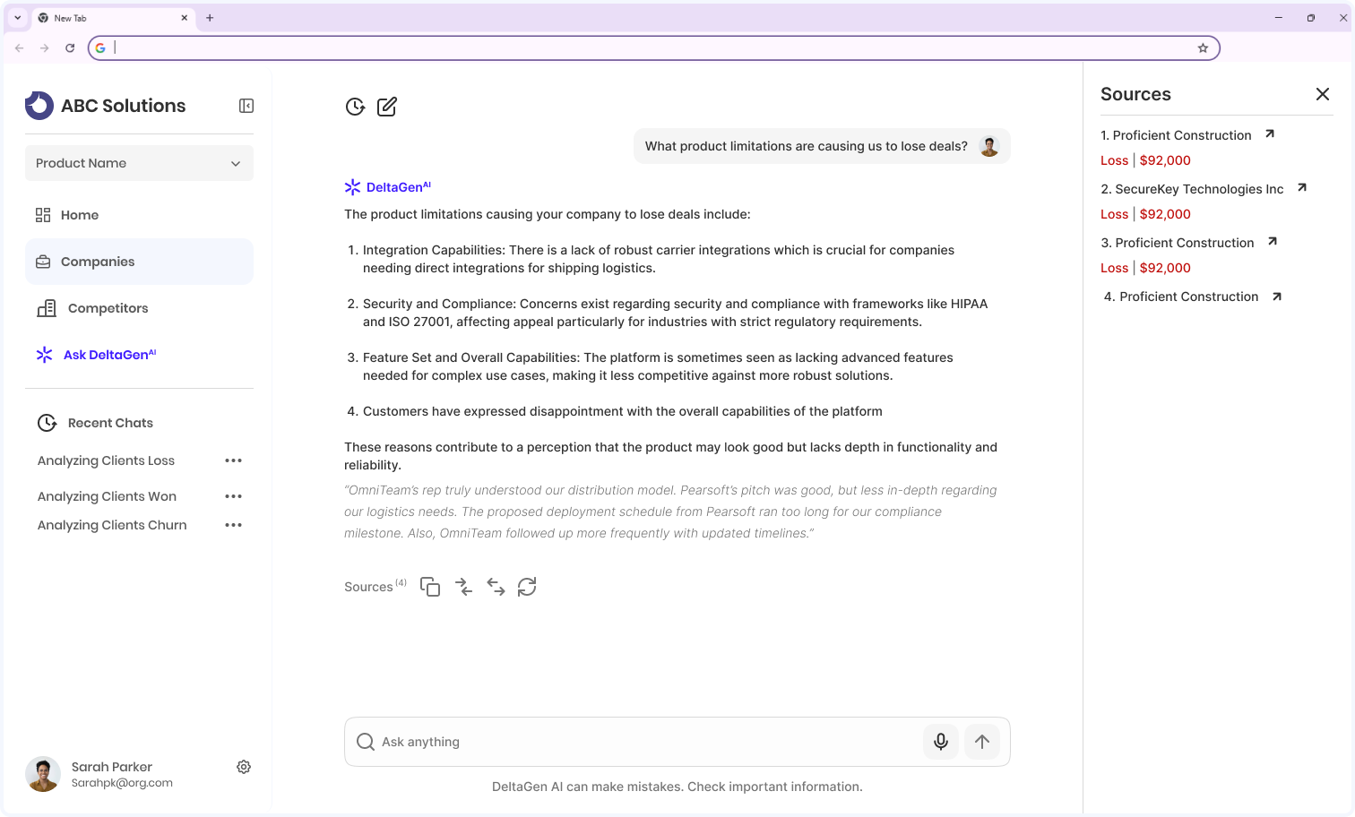 See which rivals are winning and why. DeltaGen flags when a competitor influenced the outcome — with direct buyer quotes. Spot patterns in positioning, pricing, and feature gaps before they cost you more deals.