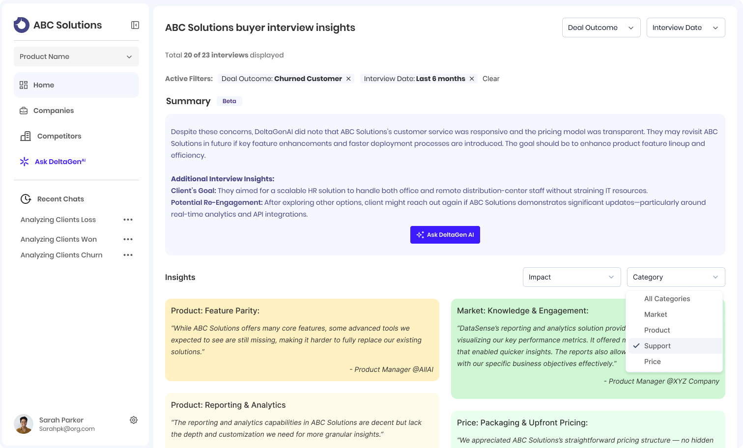 Our AI continuously analyzes competitor mentions across all interviews to surface strategic insights. With our built-in chatbot, you can dive deeper into specific deals, uncover root causes, and get clear, data-backed answers — all without leaving the platform.